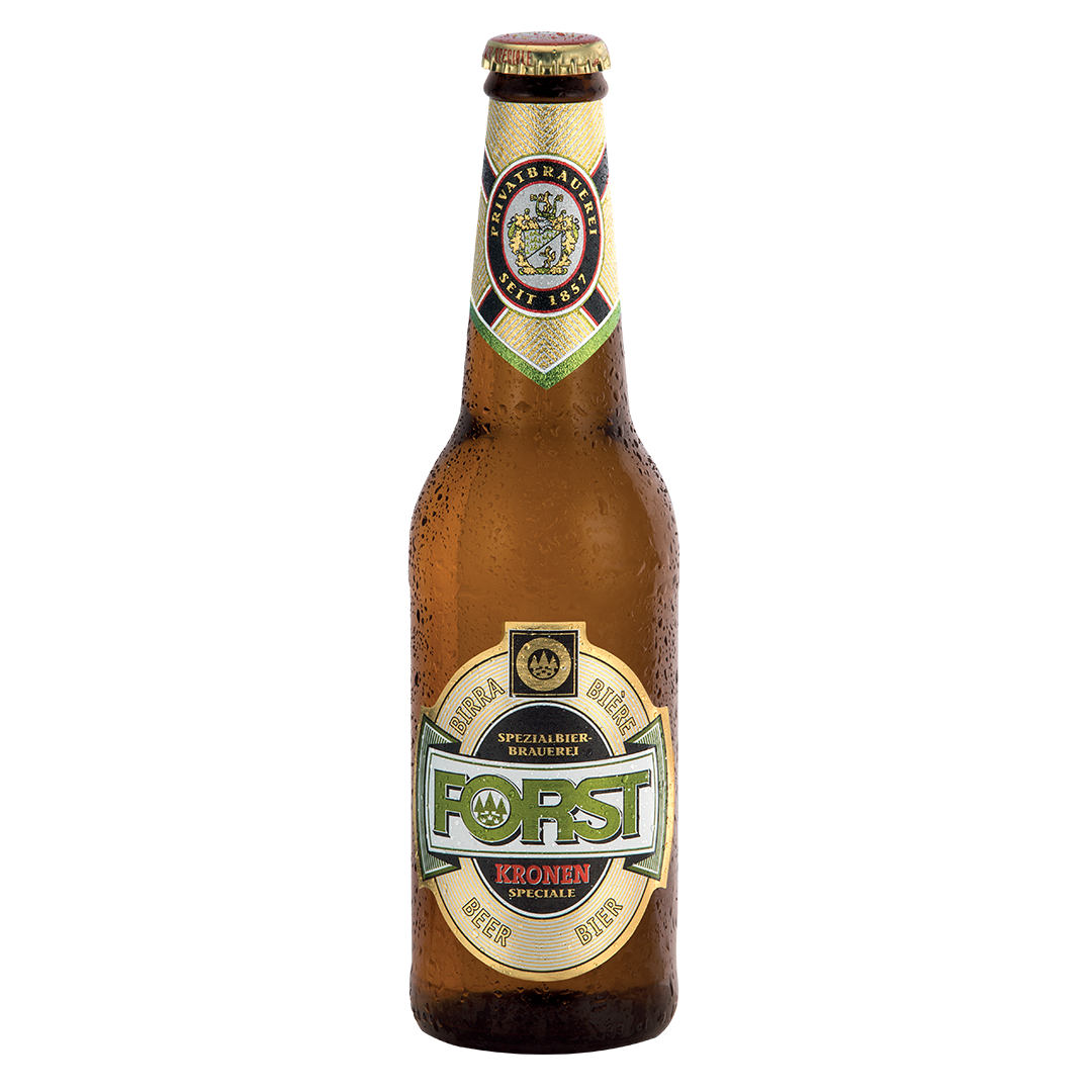 Бира FORST Kronen в бутилка с леко горчив плътен вкус, малцови нотки, златистожълт цвят, много лек привкус на хмел и фина пяна.