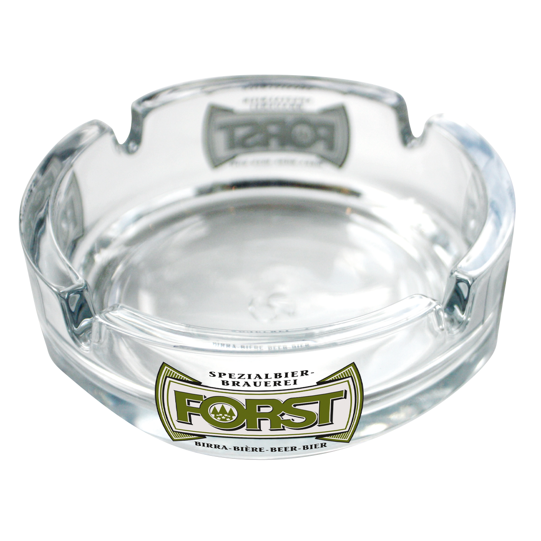 Кръгъл, стъклен пепелник с лого FORST.